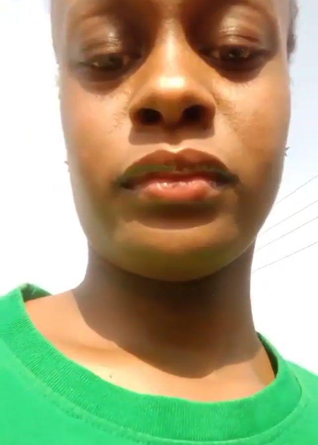 A close-up shot shows a person with dark skin and a shaved head, wearing a green t-shirt. The person looks directly at the camera with a serious expression. The background includes a bright sky and some trees. There is a faint electrical line visible on the right side of the frame. The camera appears to be held by the person in the video, or someone very close to them. Sounds of passing vehicles can be heard in the background.