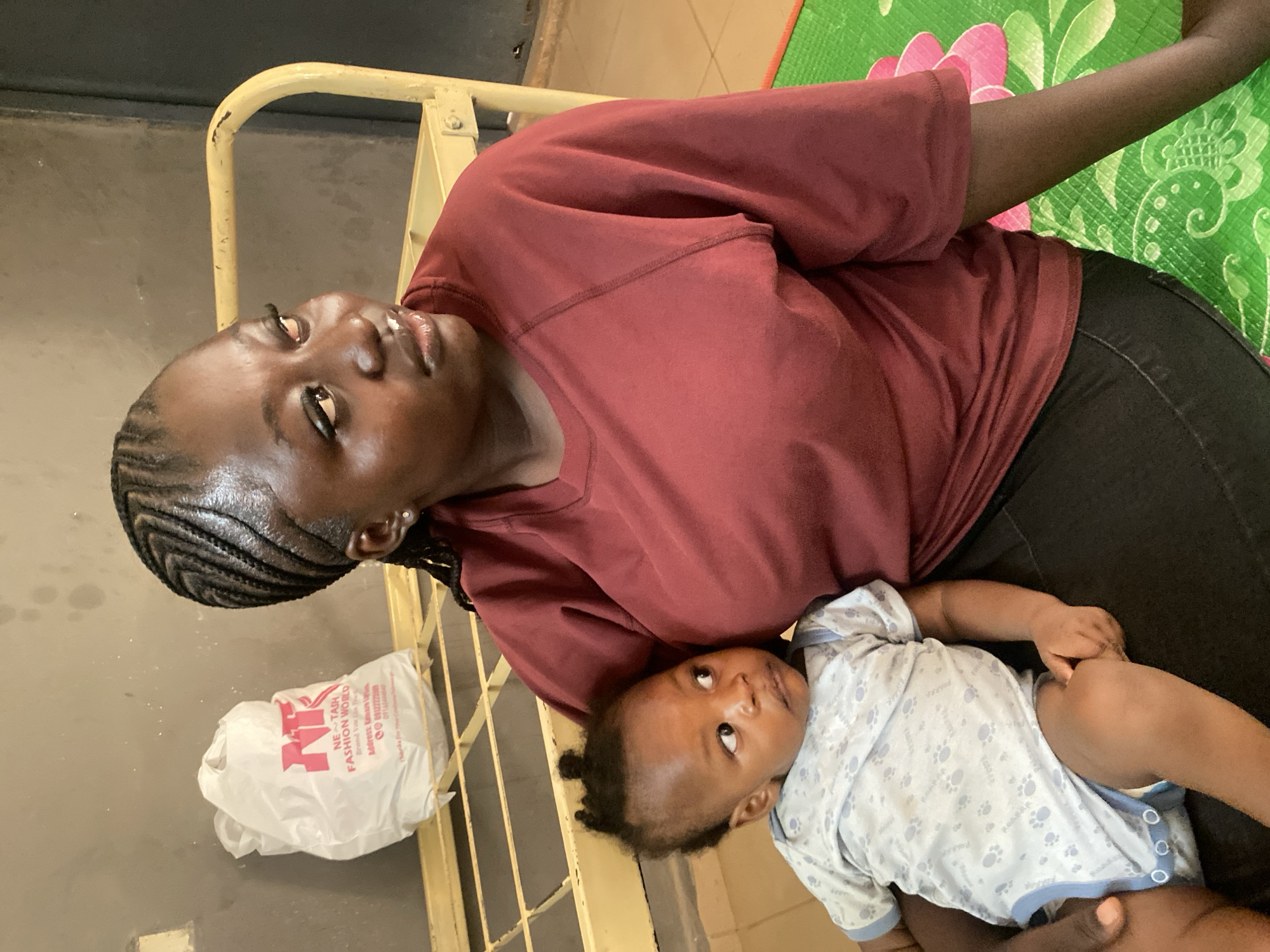A woman in a maroon shirt and black pants holds a baby in a light blue and white onesie. The woman is on a yellow cot or bed, with a white plastic shopping bag at her feet. A green floral-patterned surface is partially visible in the background. The location is Rido, Nigeria.
