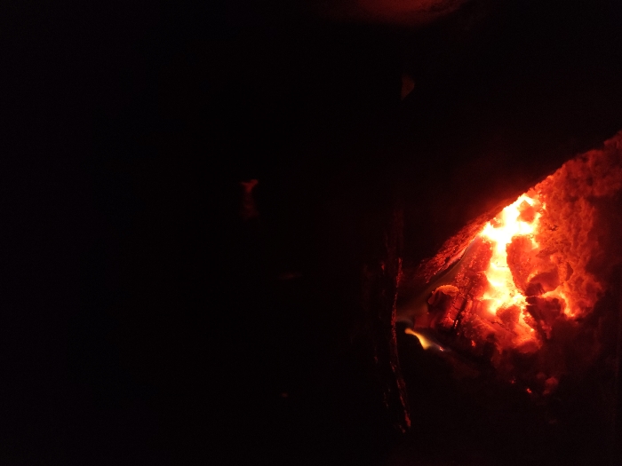 The image displays a close-up view of actively burning embers and flames within a dark, enclosed space, located in Staro Selo, Bulgaria
