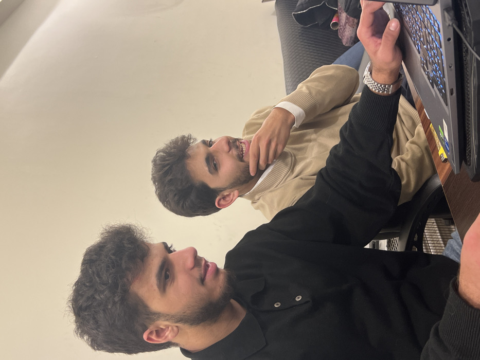 Two young men are in the frame. One, in a black shirt, looks to the right. The other, in a tan sweater, looks to the left and is smiling with his hand near his mouth. A laptop sits on a dark brown desk in the upper right corner, illuminated by the screen. Seated behind the tan sweater is a cushioned chair. A beige-colored wall fills the left background.