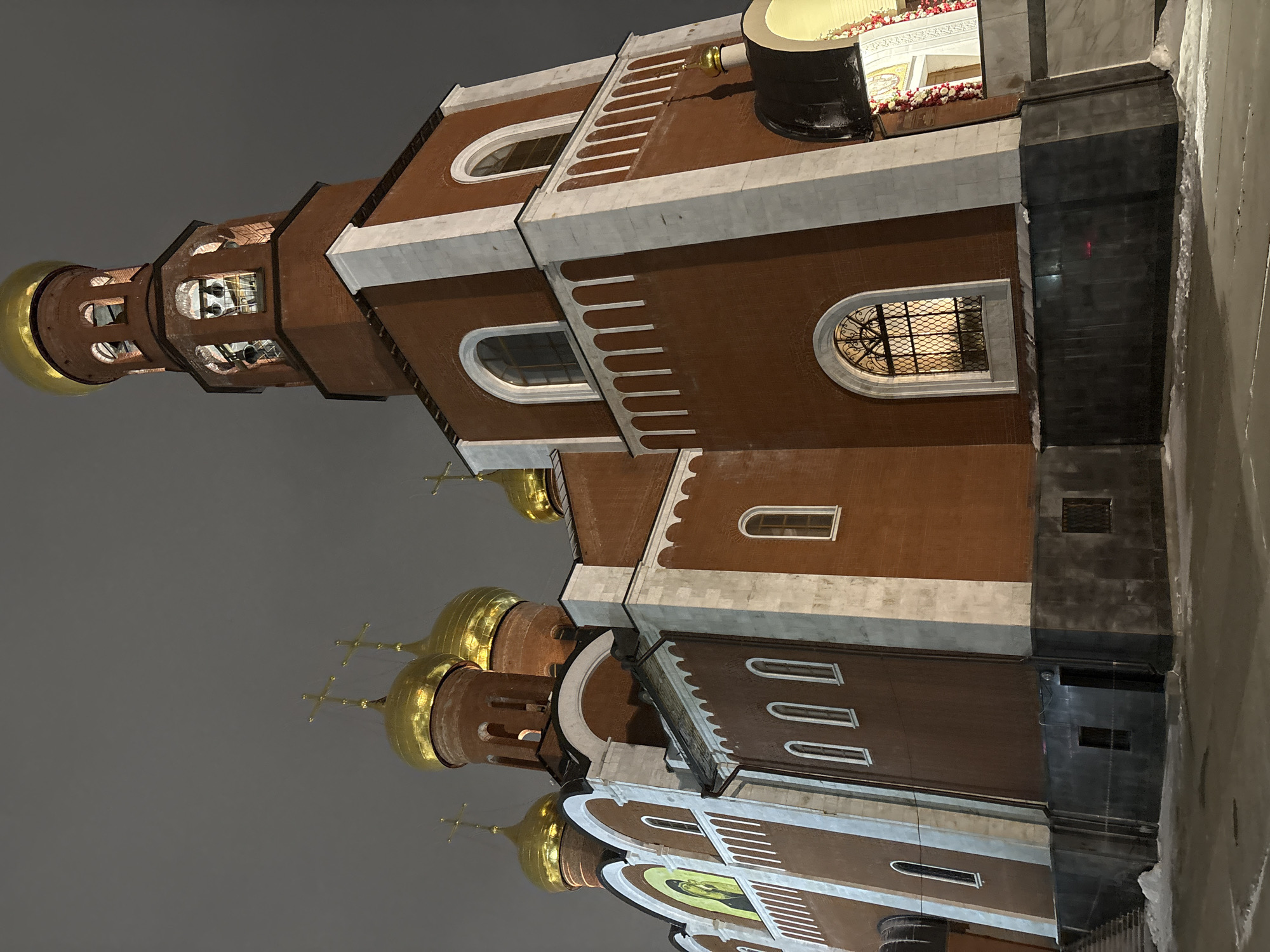 This image shows a church at night. The building is tall and narrow, with brown brick walls and white trim. It has a series of gold domes on top and a tall bell tower. The sky is gray and overcast. The church is located in the city of Nizhnevartovsk, Russia. There are no people visible in the image.