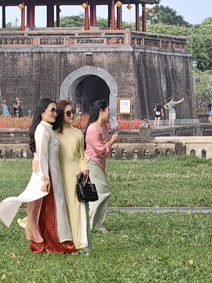An outdoor image depicts three women in the foreground on a grassy area, with a large, ancient brick and stone gate structure in the background. The scene is located within the Imperial City of Hue, specifically in Phú Xuân Ward, Vietnam. In the foreground, from left to right: 1. A woman with long dark hair, wearing a white Áo Dài over a red-orange skirt, sunglasses, and a pearl necklace. She stands facing right, with her left arm draped around the waist of the adjacent woman. 2. A woman with short brown hair, wearing a yellow Áo Dài, sunglasses, and holding a black quilted handbag with a gold-colored 'CD' charm in her left hand. She stands facing right, with her right arm around the first woman's back. 3. A woman with long dark hair, wearing a pink long-sleeved top with textured fabric and light green trousers. She holds a patterned decorative fan in her right hand and is positioned slightly behind and to the right of the other two women, looking right. The women are standing on a sparse green lawn. In the mid-ground, a substantial historical edifice, characteristic of a gate from the Hue Imperial City, dominates. It features a large arched entrance at its base, constructed from dark brick and stone. Above the brickwork, a multi-tiered wooden structure with red pillars, an ornate roof, and hanging yellow lanterns is visible. Red-flowering plants are cultivated in beds in front of the gate's lower section. A yellow and white informational sign is partially visible to the right of the archway. In the background, on a raised stone platform or walkway near the gate, several individuals are present. Notably, two individuals are visible on the right side of the gate structure: one in dark clothing and another in a light green t-shirt and light shorts, extending an arm as if pointing or taking a photograph. Lush green foliage from trees is visible beyond the gate structure, suggesting a park-like environment. The overall lighting is bright, indicating daylight.