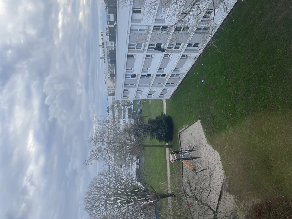 The image presents an elevated, wide-angle view of a residential district in Caen, France, under a heavily overcast, grey sky. The scene encompasses a communal green space flanked by multi-story apartment buildings. In the lower-left quadrant, a children's playground is situated on a sand-filled surface. It contains a climbing structure featuring orange, black, and metal components, with red and white striped caution tape wrapped around parts of it. Adjacent to the playground, a manicured green lawn extends across the mid-ground towards a multi-story apartment building on the right. Several small pieces of white debris and one larger white rectangular object are scattered on this lawn near the building. The prominent apartment building on the right side of the frame is a five-story structure with a light grey and white facade, featuring multiple rectangular windows. On the third floor from the bottom, a dark, rectangular object, consistent with a piece of fabric or tarp, is partially draped and hangs from an open window. Further into the mid-ground, beyond the immediate lawn, a paved pathway curves through additional green space populated by several bare deciduous trees and a dense, dark green evergreen shrub. In the background, numerous other multi-story residential buildings, primarily white, are visible. Several vehicles are parked on an unseen street or parking area behind these structures. The distant horizon reveals additional urban development and two slender, tall industrial-style stacks or chimneys. The entire environment is devoid of human presence.