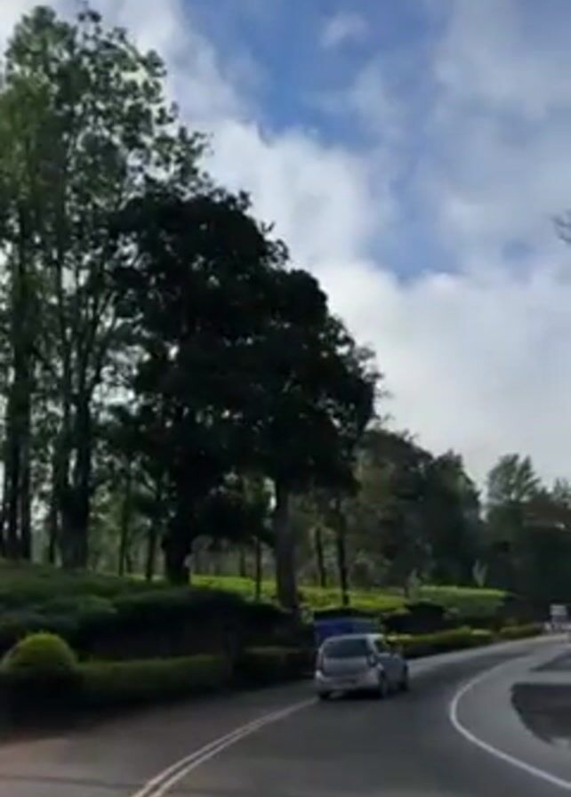 vehicle moving along a winding asphalt road on a partially cloudy day. The road is marked with white lines. On one side, there are rows of green tea bushes and tall trees, and utility poles with overhead wires. Other vehicles are visible on the road including cars and three-wheeled vehicles. The sky is blue with scattered white clouds.