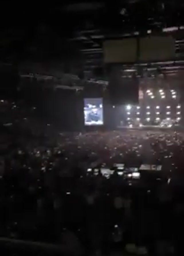 concert in a large indoor arena. The arena is packed with people, most of whom are holding up their phones to record the performance. The stage is brightly lit with numerous spotlights. Two large screens flank the stage, displaying images of the performers. The crowd is densely packed, with only small pockets of open space visible. The video is shot from a high vantage point, providing a wide view of the scene.