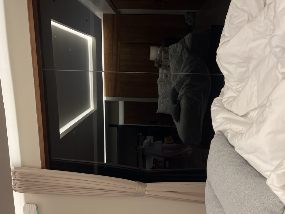 - "The image displays an interior view of a room, likely a bedroom, with the vantage point from a bed featuring rumpled white bedding and a grey pillow in the immediate foreground" by FM-e7FLd2, licensed under CC BY 4.0