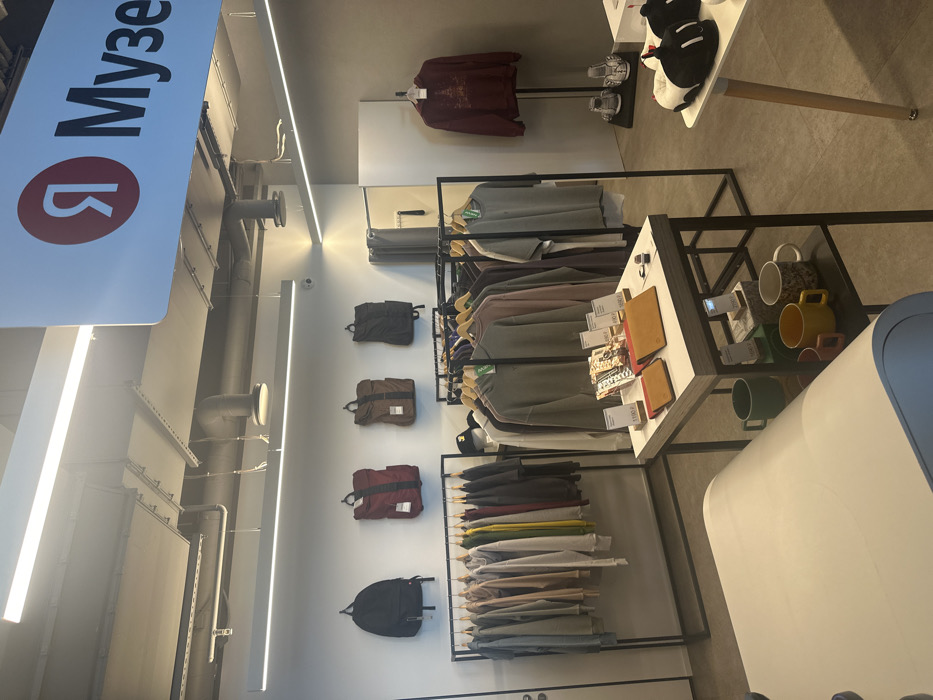 The scene is a clothing store in Дружба, Russia, located at 55.956 latitude, 37.434 longitude. The store is sparsely furnished with a clothing rack displaying various sweatshirts and long-sleeved shirts. Four backpacks are hung on the wall behind the rack. In the background, a second clothing rack displays hoodies and a long-sleeved burgundy shirt. A black, white, and red sneaker sits on a table to the right. A smaller table to the left displays a variety of items including four mugs, a tablet, a wallet, and various boxes. There is a sign above the entrance of the store that reads "я Музе" in Cyrillic script, which is the word for "I Museum". The store is lit by fluorescent lighting and there are no people present.