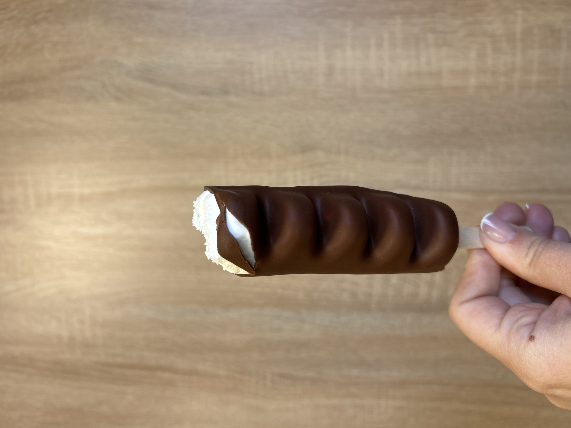 - "A hand holds a chocolate-covered ice cream bar with a wooden stick against a light brown wooden surface" by FM-ZgnHF3, licensed under CC BY 4.0