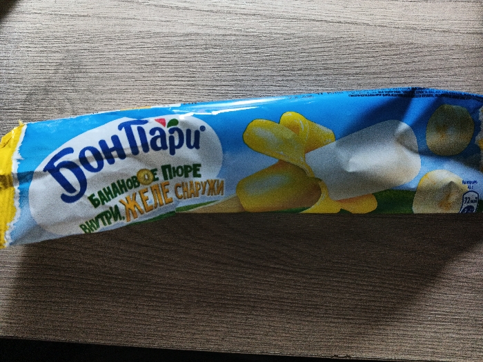 - "A partially crinkled Bon Pari brand food package rests horizontally on a light brown wood-grain surface, likely a tabletop, in Chaikovsky, Russia" by FM-vVA6O2, licensed under CC BY 4.0