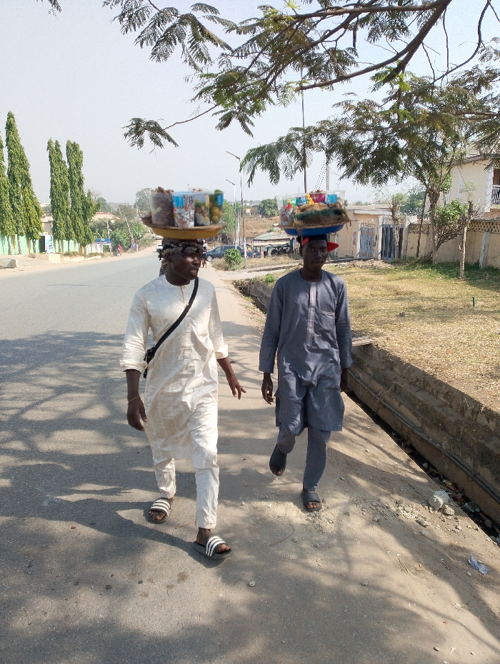 Two adult males are observed walking along the paved shoulder of a road in Kubwa, Nigeria. The individual on the left wears a light-colored long-sleeved tunic and matching trousers, paired with black and white striped slide sandals. A black shoulder bag is worn across his body. He has a patterned cloth wrapped on his head, supporting a dark, round tray laden with various packaged nuts and snacks in clear plastic containers. He is looking to his left. The individual on the right wears a dark grey long-sleeved tunic and trousers with dark sandals. A blue item, possibly a cushion, is on his head, supporting a light-colored round tray carrying similar packaged snacks. To the right of the men is a concrete drainage channel containing debris. The paved road to their left is lined by tall, slender evergreen trees and distant buildings. Overhead tree branches with green foliage cast shadows across the ground. The background features a bright, clear sky and distant hills.
