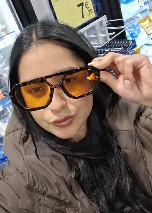 A woman with long, dark hair is trying on a pair of large, tortoiseshell sunglasses with orange lenses in what appears to be a grocery store. She is wearing a brown, quilted jacket and has a neutral expression. In the background are shelves stocked with various products, including some marked with a price tag of €7.70. She is looking directly at the camera and adjusts the sunglasses.
