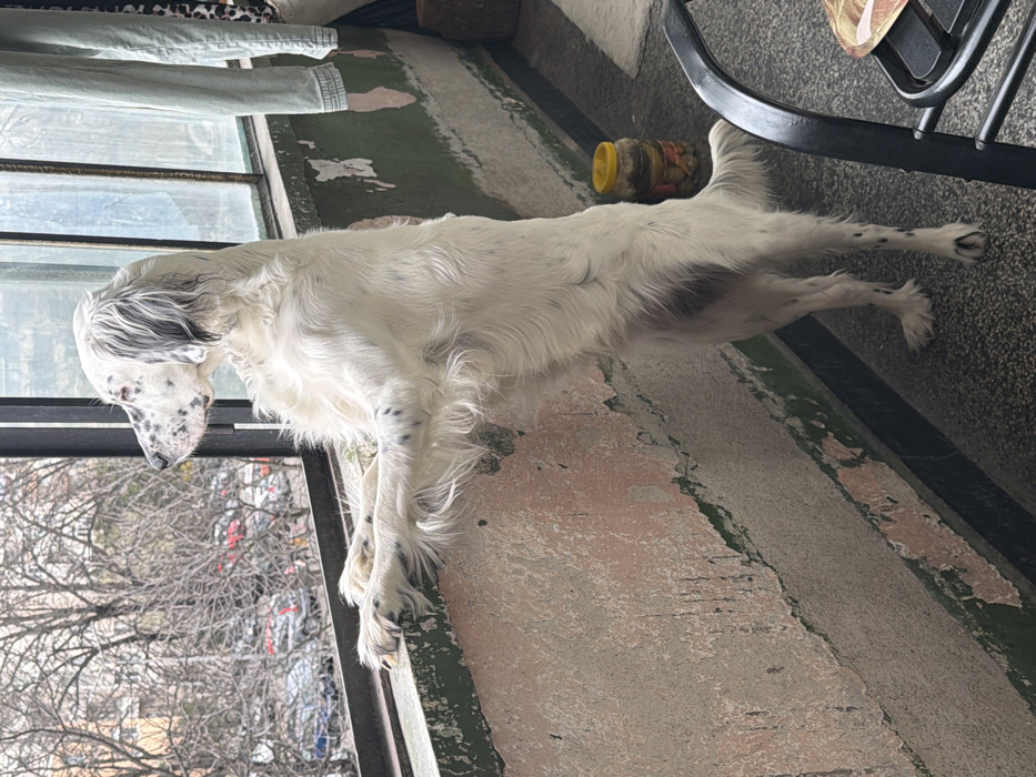 An English Setter dog stands on its hind legs on a residential balcony in Stara Zagora, Bulgaria, looking out through an open window or railing