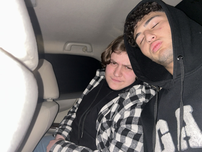 Two young men are inside a car. One wears a black hoodie, has curly dark hair, and is pursing his lips, appearing sleepy. The other has dark hair, a black zip-up vest, and a white and black checkered flannel. The interior shows car seats and a dark window. It is poorly lit.
