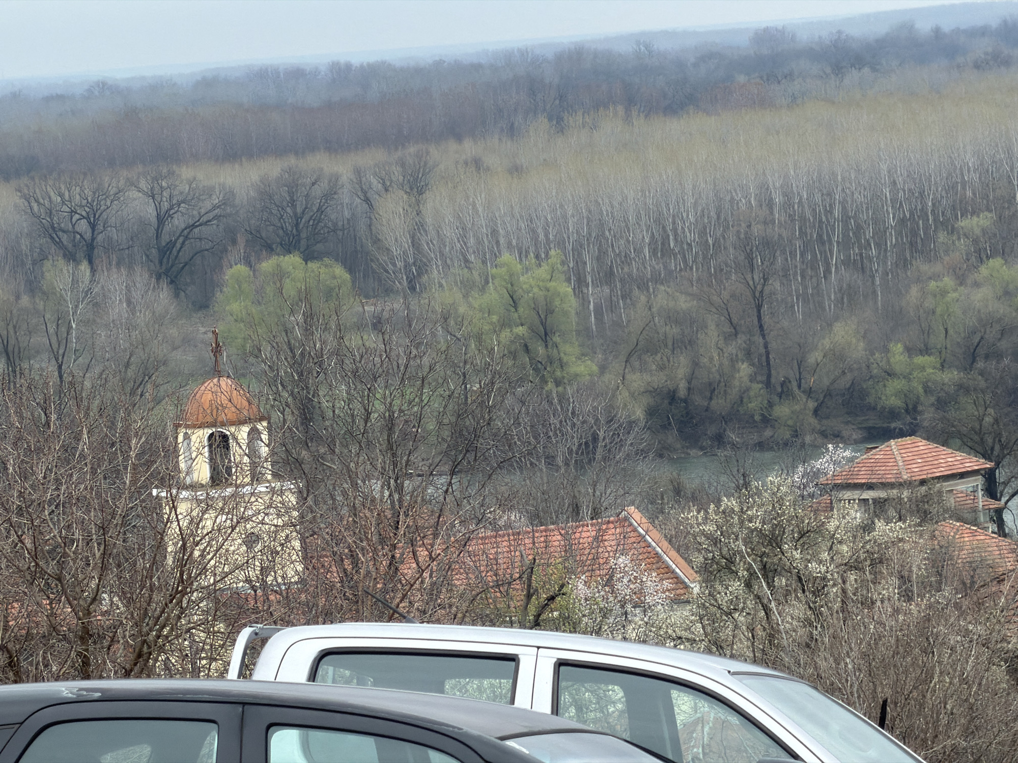 The image, taken in Vardim, Bulgaria, presents an elevated view of a landscape featuring a combination of natural and built elements. In the foreground, parts of two cars are visible, one gray and one black. Behind them, a cluster of buildings with red tile roofs are nestled amongst bare trees and blossoming trees. A church tower, painted in yellow, with a copper-colored dome and a cross, stands out amidst the branches. Further in the background, dense forests stretch across the horizon, exhibiting various shades of brown and green, suggesting different types of trees or stages of growth. A body of water snakes through the forest, and the sky is overcast. The overall scene appears to be in the early spring, evidenced by the blossoming trees and the predominantly bare state of many others.