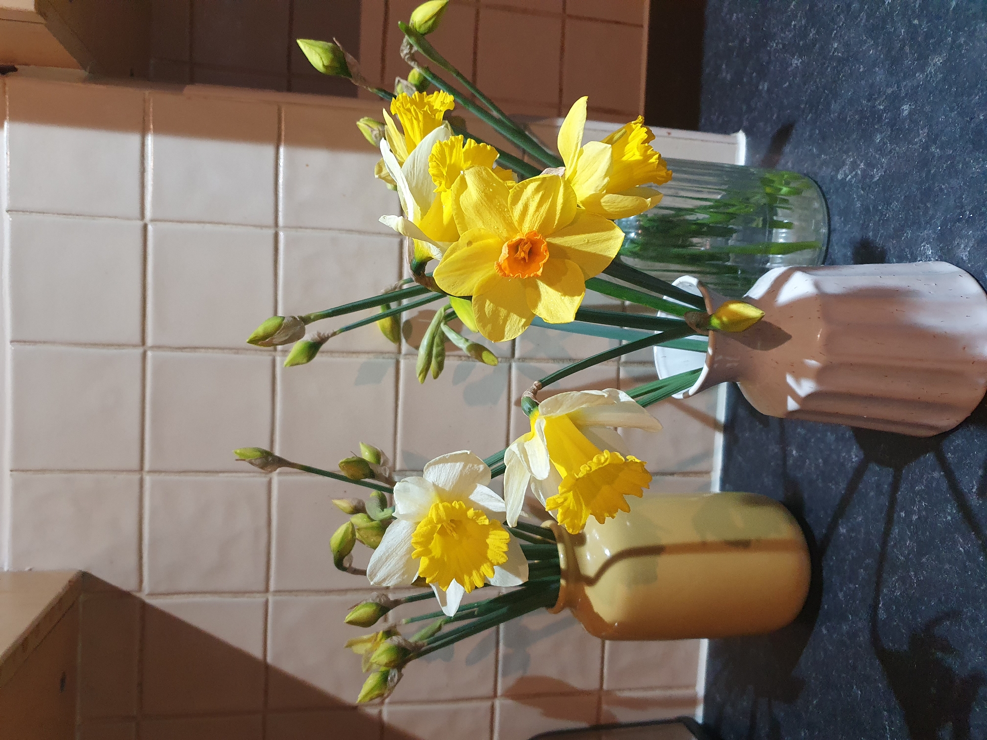 This image depicts an indoor scene, specifically an arrangement of daffodils, located in Great Yarmouth, United Kingdom