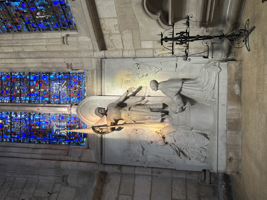 This image captures a multi-figure stone monument situated within the Chapel of Saint Joan of Arc inside the Cathédrale Saint-Pierre de Beauvais, France
