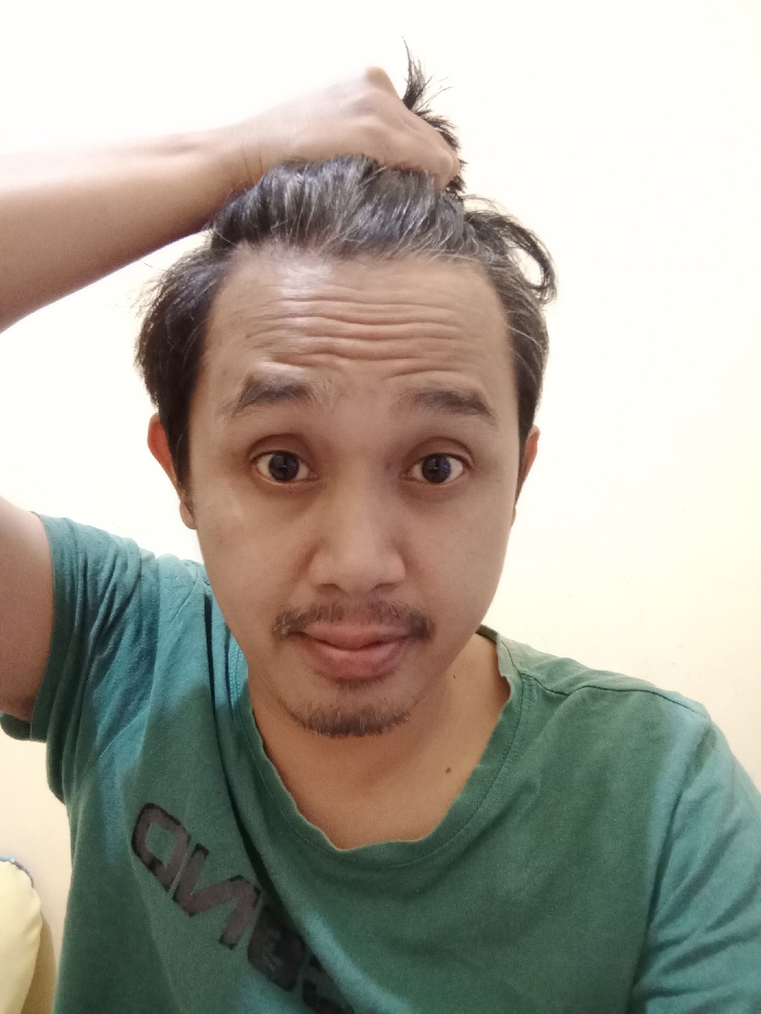 A male individual, appearing to be in an indoor setting in Brangsong, Indonesia, is depicted from the chest up. He possesses a medium skin tone, dark eyes, and dark hair showing some graying at the temples, which is being gathered and held by his right hand atop his head. Horizontal lines are visible on his forehead. He wears a dark teal or green crew-neck t-shirt with a partially visible dark graphic on the chest. His gaze is directed forward, meeting the camera. The background is a plain, light-colored wall.