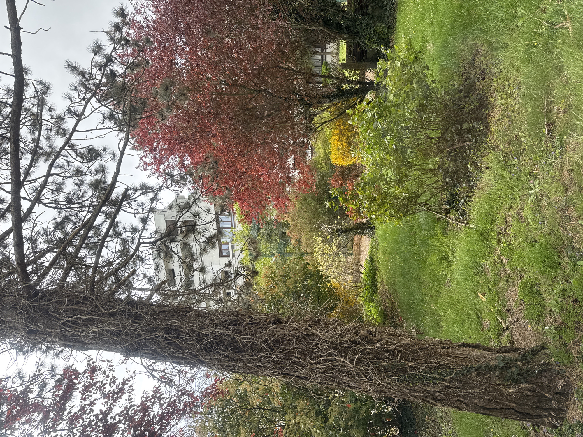 The image depicts an outdoor scene in Les Ulis, France, characterized by diverse vegetation under an overcast sky. In the left foreground, a prominent tree trunk, possibly a pine, is heavily enveloped by a dense, dry network of vine-like structures or adventitious roots. Its upper branches, featuring conifer needles, extend into the muted grey sky. To the right of this central tree, multiple deciduous trees display vibrant red foliage, contrasting with various shades of green trees and shrubs interspersed throughout the midground. A patch of bright yellow flowering bushes is visible further back in the center-right. The ground is covered with green grass, exhibiting some patches of clover and small purple wildflowers. In the background, a multi-story, light-colored building with multiple rectangular, dark-framed windows is partially visible through the trees, suggesting an urban or suburban residential context. A low, grey concrete or stone structure, possibly a wall or fence, is partially obscured by ivy on the far right. No individuals, animals, or specific actions are depicted in the scene.