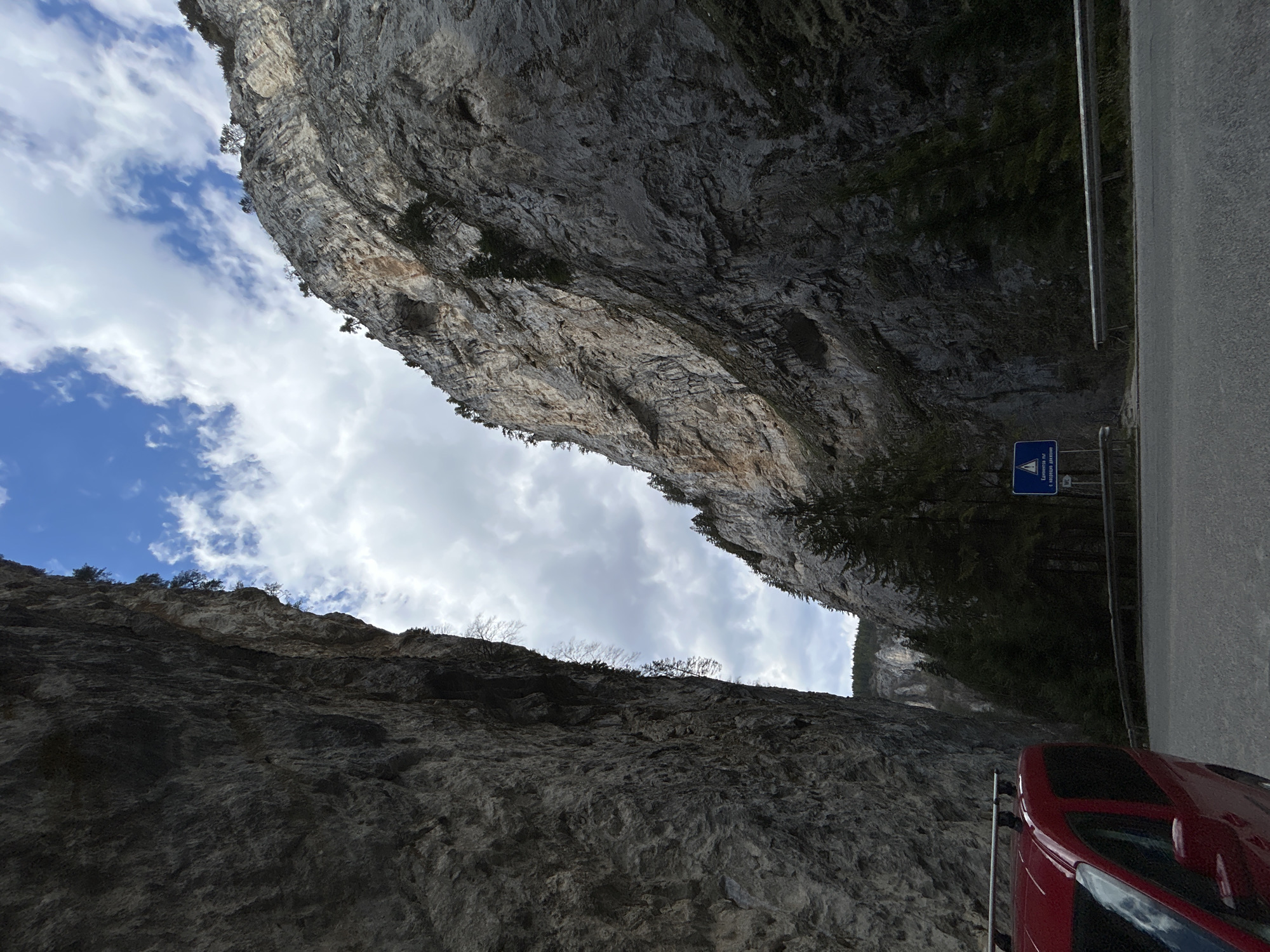 The image depicts a narrow gorge in what appears to be a mountainous region, possibly in the city of Iagodina, Bulgaria. The frame is oriented upwards, showcasing the steep, rocky walls of the gorge. A section of a paved road and a metal railing are visible on the right side of the image. There's a blue road sign next to the railing. The sky is partially obscured by the gorge walls, revealing patches of blue sky and white clouds. A red car is partially visible at the bottom right corner of the image. The scene is mostly devoid of human presence, focusing on the natural rock formations.