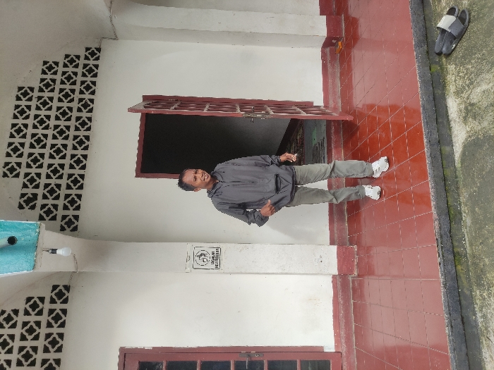 A man in a gray hoodie and pants stands in front of an open door. He smiles and gestures with his hands. The floor is tiled in red, and a pair of sandals rests on the edge. The walls are white, and there is a decorative patterned brickwork on one side. A sign is visible on a pillar.