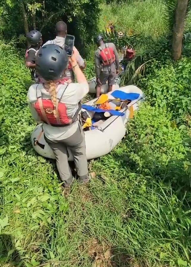 A group of five people wearing helmets and life vests are standing in a grassy, wooded area next to a white inflatable raft. One person, viewed from the back, is taking a picture of the group with their phone. The raft is partially on the ground, surrounded by lush green vegetation. The group appears to be preparing for or concluding a water activity, potentially rafting or kayaking. The surroundings suggest a tropical or forested environment.