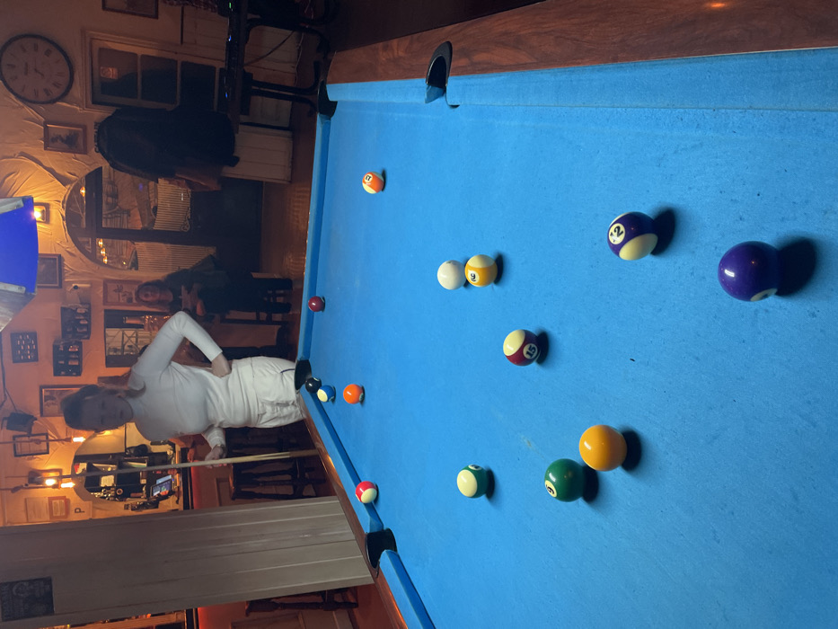 A billiard table dominates the scene, covered in blue felt and populated with a scattered array of numbered pool balls