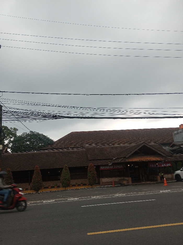 A single-story restaurant with a brown tiled roof and the sign "MASAKAN SUNDA" sits beside a road. The restaurant has dark wooden features, including a triangular overhanging roof at the entrance. Several cone-shaped shrubs line the front of the building. A motorcyclist passes by on the road. Overhead, numerous power lines crisscross the sky, which is overcast with a dull gray hue.