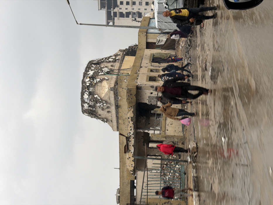 - "People walk along a wet street, shadowed by a bombed-out building riddled with bullet holes and structural damage" by FM-PSI0J3, licensed under CC BY 4.0
