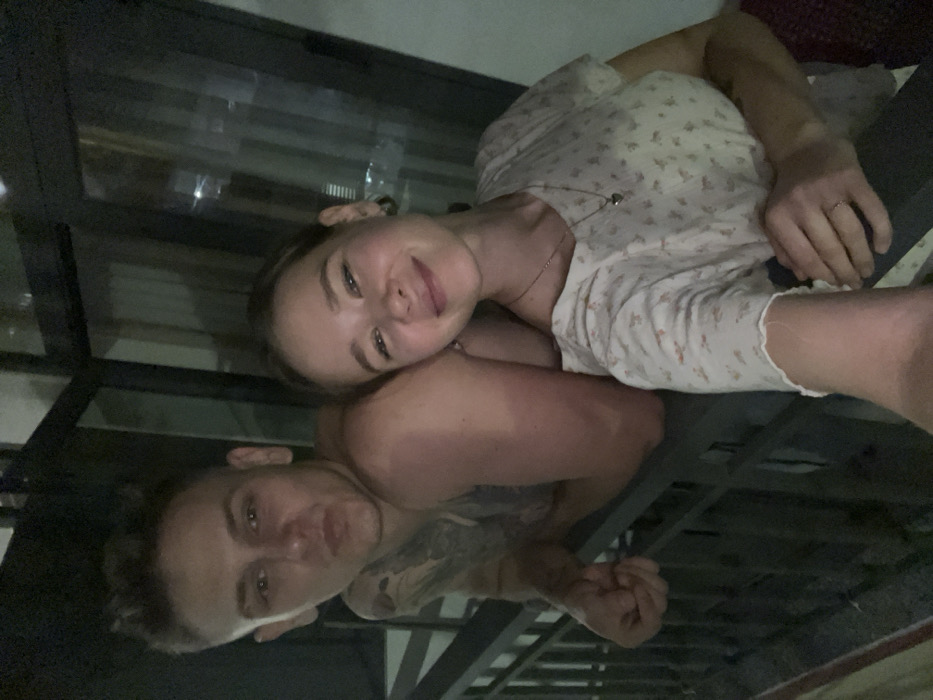 two individuals, one male and one female, in an urban environment at night. The specific location within Nha Trang, Vietnam, is not visually identifiable, but the background suggests a city setting. The male, positioned on the left, has a light complexion, short light-colored hair, and visible tattoos on his left arm and shoulder. He is shirtless, displaying a distinct tan line on his right shoulder and bicep. He leans on a dark metal railing with a puckered expression on his face, looking towards the camera. The female, positioned on the right, also has a light complexion and light brown hair. She is smiling directly into the camera. She wears a light-colored, short-sleeved top with a subtle floral pattern, a thin necklace with a heart pendant, and a ring on her left ring finger. She appears to be holding the camera, taking a selfie. Both individuals are close together. The background is dark, with indistinct reflections of city lights visible in a glass structure, possibly a window or door, in the upper right. A dark metal railing with vertical bars runs across the midground. The scene is dimly lit, consistent with nighttime conditions.
