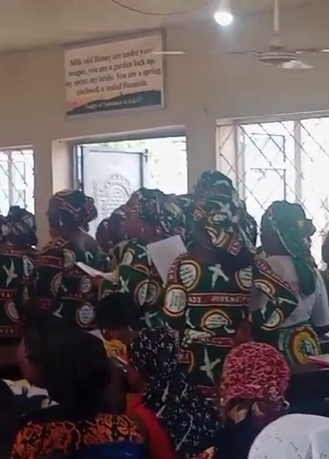 group of people singing in what appears to be a church. The main focus is on a choir consisting mostly of women wearing matching patterned outfits and headwraps, holding songbooks. They stand facing the congregation. Some members of the congregation are visible in the foreground, seated and looking towards the choir. A person with a microphone appears to be directing the choir. The room has several windows providing natural light, and there are ceiling fans and fluorescent lighting fixtures. Two framed signs hang on the wall with scriptural verses. The overall atmosphere seems to be one of religious singing and participation.