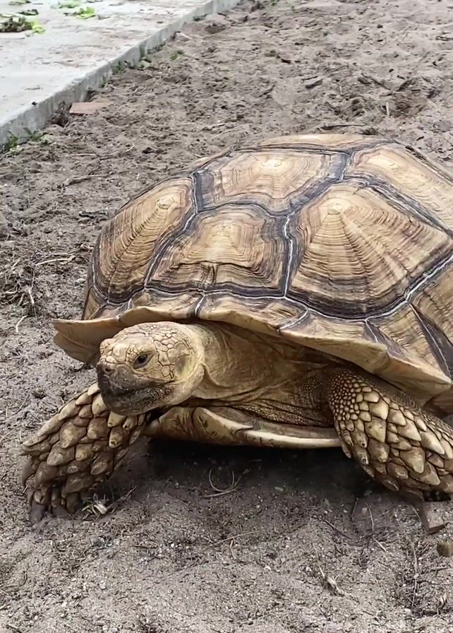 close-up of a large tortoise on sandy ground. The tortoise has a tan shell with dark brown and white markings. Its skin is a lighter tan color, and its legs are thick and textured. The tortoise is facing the camera and appears to be moving slightly. The background includes patches of dry grass and a concrete structure in the distance. The overall lighting is bright and natural.