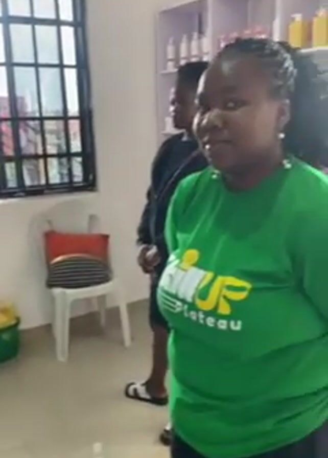 n indoor scene with a woman wearing a green t-shirt with the words "Lift Up Plateau" printed on it. She is smiling and looking to her left. Another person is visible in the background, partially obscured. There's a white shelf filled with various bottled products against the wall. A window is in the background and a white chair with a colorful pillow is nearby. The floor appears to be tile.