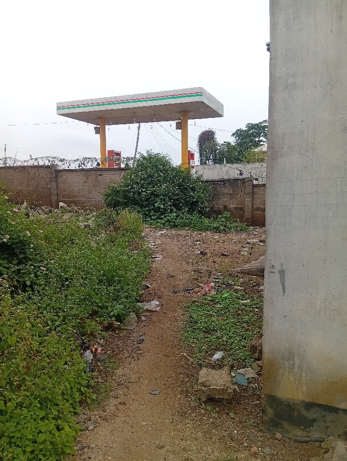 The image captures a disused plot of land adjacent to a fuel station in Ozuri, Nigeria, under an overcast sky