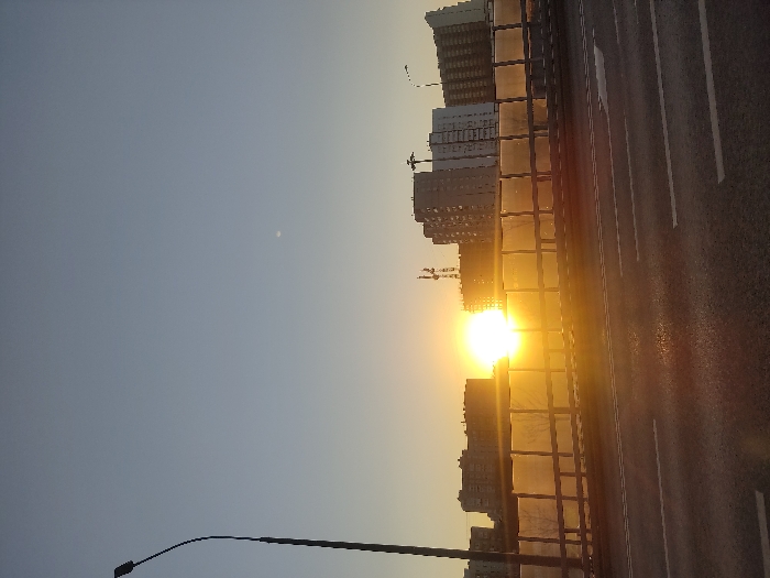 The image displays an urban landscape in Moscow, Russia, captured during either sunrise or sunset. A bright, low-lying sun is prominent slightly left of the image center, creating intense glare and a warm, orange hue near the horizon, which contrasts with the pale blue sky overhead where a faint crescent moon is visible in the upper right. In the foreground, a multi-lane asphalt road with multiple white lane markings extends across the bottom of the frame. Immediately above the road, a translucent sound barrier, structured with a dark metal frame, reflects the sunlight prominently. Behind this barrier, numerous multi-story buildings, appearing as residential or commercial structures, form a silhouette against the sun's glow. A tall, dark, curved streetlamp stands vertically on the far left. Several communication towers or construction cranes are interspersed among the background buildings. No individuals or active subjects are visible within the scene.