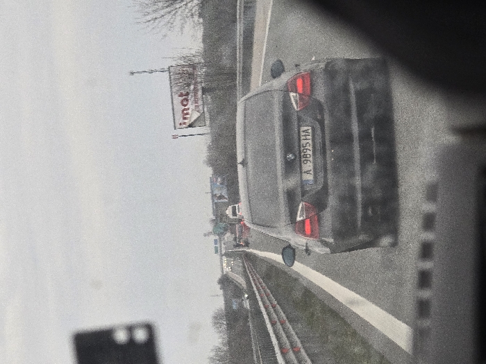 The scene depicts a multi-lane highway near Orizovo, Bulgaria, under an overcast sky. The photograph is taken from inside a vehicle, with a portion of the dashboard or interior structure visible in the lower foreground. The primary subject is a dark-colored BMW sedan, bearing Bulgarian license plate "A 9895 HA," positioned directly ahead of the camera's vehicle in the same lane. The BMW's brake lights are illuminated. To the left, a concrete median barrier separates traffic, and further down the road, other vehicles, including a white van, are visible in motion. On the right side of the highway, a large billboard with the red text "imat" is visible above sparse, bare trees. A metal crash barrier runs along the right shoulder. No individuals are explicitly discernible. Vehicles are in transit on the highway.