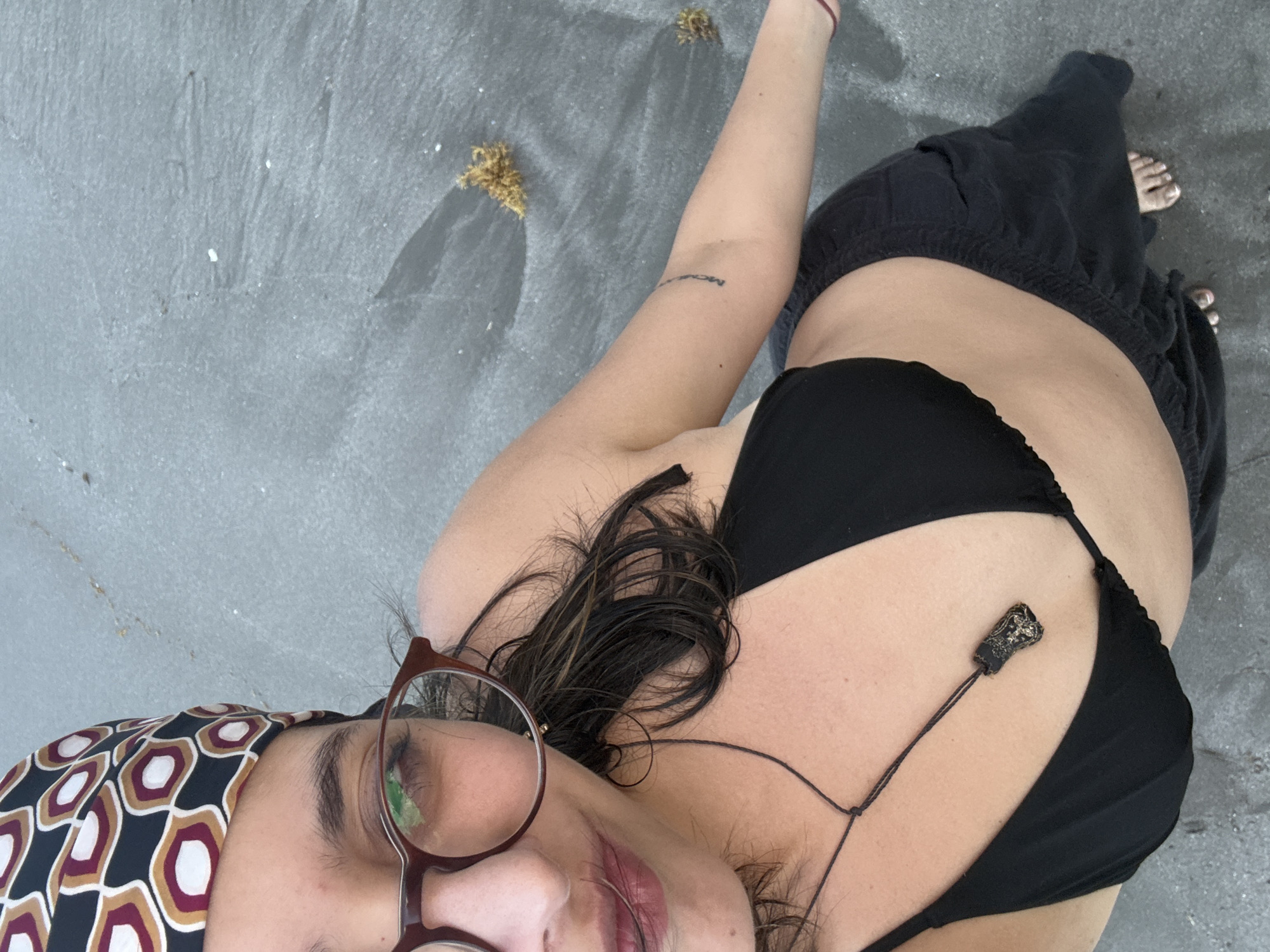 A woman is lying on a gray surface, possibly sand, in Mata de Uva, Mexico. She wears a black bikini top and dark, loose-fitting pants. The woman also has a patterned headscarf and glasses. Small clusters of dry plant matter are scattered on the ground.