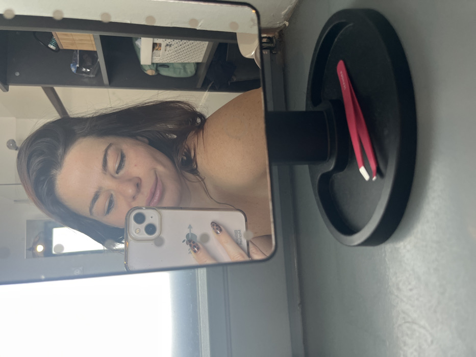 The image displays a mirror selfie taken by a woman in an interior setting in Roubaix, France. A female subject with brown hair and bare shoulders is reflected in an illuminated vanity mirror with a black circular base. She holds a light-colored smartphone, equipped with dual rear cameras, in her right hand, positioned to capture her reflection. Her fingernails exhibit a leopard print design. The woman is looking down towards the phone, her lips slightly parted in a subtle smile. Resting on the recessed tray of the mirror's base is a pair of red "SEPHORA" brand tweezers with white tips. In the background, visible through the mirror's reflection, is a dark-colored shelf unit containing various items, including a white wicker basket, a green soft container, and other objects in compartments. To the left of the reflection, a bright, diffuse light source, consistent with a window, is visible. The mirror rests on a light grey countertop or surface.