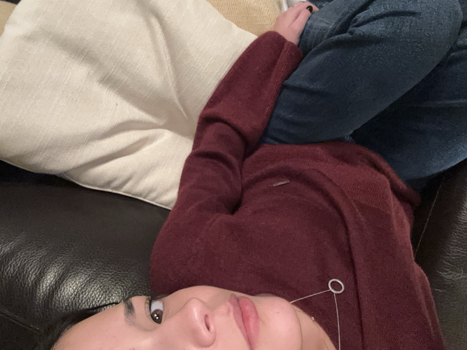 A young adult individual, appearing female, is depicted in a partial, slightly high-angle indoor shot, reclining on dark brown or black leather furniture