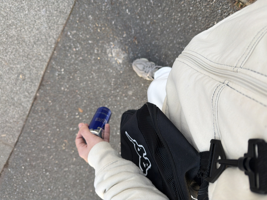 The image presents a first-person, downward-facing view of an individual standing or walking outdoors. The subject's left arm, torso, and right leg are visible. The left hand holds a dark blue, cylindrical bottle, likely a fragrance, with a silver-toned cap and the word "ALLURE" partially legible on its label. A black shoulder bag or fanny pack, featuring a white stylized logo (resembling a Kappa logo) and a side mesh pocket, rests against the person's left hip/thigh area. A black plastic clasp from the bag's strap is visible at the bottom of the frame. The person is wearing a light-colored (off-white/beige) long-sleeved top and matching pants with visible external stitching and a vertical zipper detail on the side. A grey athletic shoe is visible on the right foot. The ground beneath is a coarse, speckled grey asphalt or concrete surface, consistent with a sidewalk or street. The precise location within the city of Fürth, Germany, is not discernible from the visual information provided.