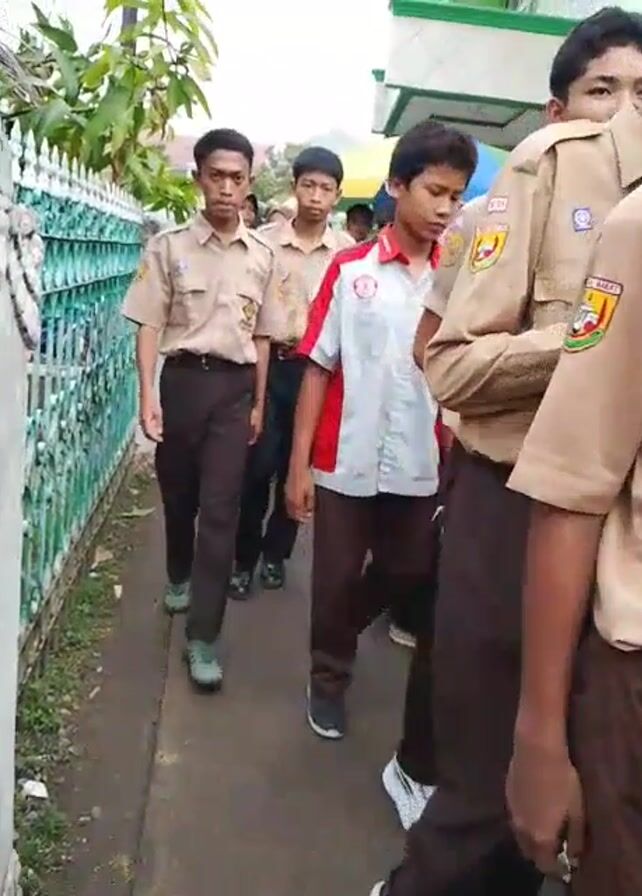 group of young people walking along a sidewalk next to a green fence. They are dressed in school uniforms of tan shirts and brown pants or skirts. Some are wearing hijabs. The sidewalk is concrete and there is some vegetation visible alongside the fence. A white building is partially visible in the background. The camera follows the group as they walk.