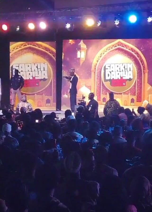 A crowded event is taking place indoors. A stage is set with two large screens displaying identical images of “Sarkin Dariya” against a background that suggests a Middle Eastern or Islamic theme. On stage, a man in a suit and cap is speaking into a microphone. Several other people are also on stage, including cameramen. A performer is walking towards the man in a suit. The audience is seated and many are holding up phones. The event seems to be well-lit and festive. The room is dim, with blue and yellow stage lights shining. The event is branded with “Maltina.”