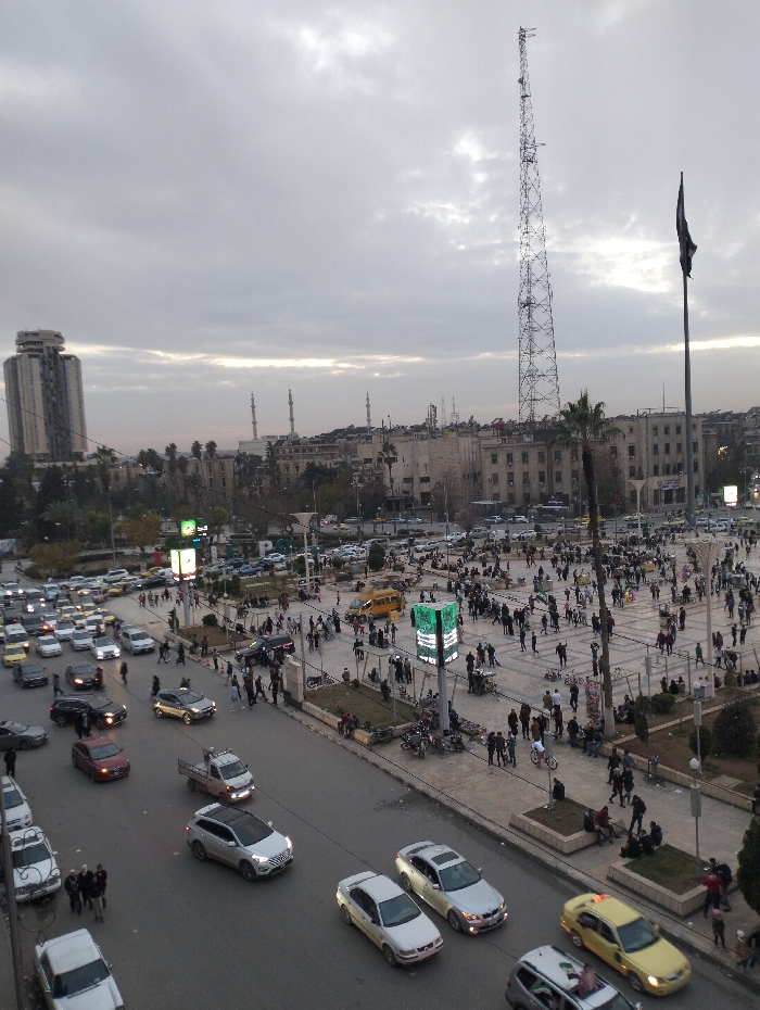 An aerial view showcases a bustling city square filled with pedestrians. Roads surrounding the square are active with car traffic. A tall telecommunications tower and a flagpole with a dark flag stand prominently in the background. Several buildings with minarets are visible on the horizon. Overcast skies create a muted light across the scene. A modern high-rise building stands out on the left.
