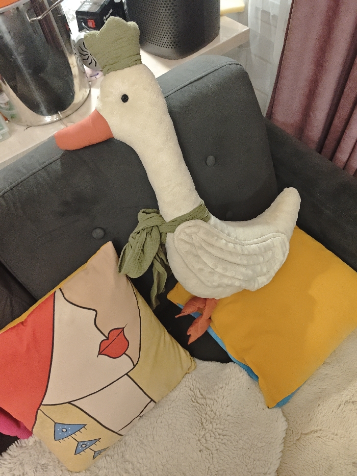 A plush goose wearing a green crown and scarf rests on a dark gray couch. An orange and tan pillow with a face design sits to the left of the goose. A bright yellow pillow with blue edges is on the right, partially obscured by the goose. Fluffy, off-white material is visible beneath the pillows. A metal container and other items are partially visible on a surface behind the couch. A section of a curtain is on the right.