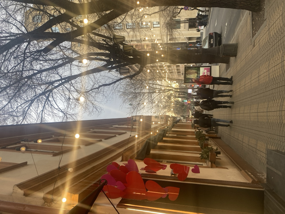 The image depicts an urban street scene in Yerevan, Armenia, during late afternoon or early evening, characterized by warm, low-angle sunlight creating lens flares and elongated shadows. The left side of the frame features a multi-story building with an off-white facade and brown trim, adorned with decorative string lights extending along its length. Near the foreground, a cluster of red and pink heart-shaped cutouts hangs vertically from the building, possibly indicating a commercial establishment like a cafe or restaurant. Planter boxes are visible beneath windows along the building's base. A patterned sidewalk occupies the foreground, upon which multiple pedestrians are walking. Four individuals are prominent in the midground, walking away from the camera: one in a dark jacket and blue jeans, followed by two others in dark attire, and a person in a red jacket. Further down the sidewalk, additional pedestrians are visible. To the right of the sidewalk, a street runs parallel, with at least one dark sedan visible. The street is lined with numerous bare deciduous trees, their branches devoid of leaves, suggesting a late autumn or winter season. Many of these trees are wrapped with string lights, and some also feature traditional decorative street lanterns hanging from their trunks or branches. A tall lamppost stands prominently near the street. In the distance, other multi-story buildings of varying architectural styles are visible, along with traffic lights and a digital billboard on the sidewalk's edge. A faint, ethereal rainbow arc is discernible in the sky above the distant buildings and trees. The overall environment is active, illuminated by both natural light and artificial string lights.
