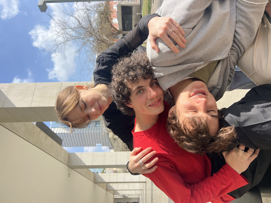 The image depicts three young individuals, two males and one female, in a close, stacked pose under bright daylight. The scene is an outdoor urban environment, specifically the Sarona complex in Tel-Aviv, Israel, indicated by a prominent modern skyscraper resembling the Azrieli Sarona Tower visible in the background. This tower, with a distinctive grid-patterned facade, is partially obscured by a light-colored concrete colonnade running horizontally. The subjects are arranged vertically: 1. **Top Subject (Female):** Possessing light brown hair and a fair complexion, she wears a black long-sleeved top. Her eyes are lowered or gently closed, and she displays a slight smile. Her left hand, adorned with two rings on the index and ring fingers, rests on the upper arm of the middle subject. Her right arm is positioned around the middle subject's upper back. 2. **Middle Subject (Male):** Features dark curly hair and wears a red long-sleeved shirt. He is smiling broadly, revealing dental braces, and looking directly at the camera. His head rests on the head/shoulder area of the bottom subject. A ring is present on his left hand's ring finger. 3. **Bottom Subject (Male):** Has brown, wavy hair and is dressed in a light olive green t-shirt under a light grey hooded sweatshirt, paired with dark trousers. He is smiling widely, with eyes squinted, and looking towards the camera. His head is tilted to the left, resting on an unseen surface or his own arm. His right hand, wearing a ring on the ring finger, grips the upper arm of the middle subject. All individuals are in close physical contact, with the top subject leaning on the middle subject, who in turn leans on the bottom subject. Their expressions and interactions suggest a comfortable and positive relationship. The background includes bare tree branches to the right, a street light, and a paved urban ground. The sky is clear blue with scattered white clouds, indicating a sunny day with strong natural lighting.