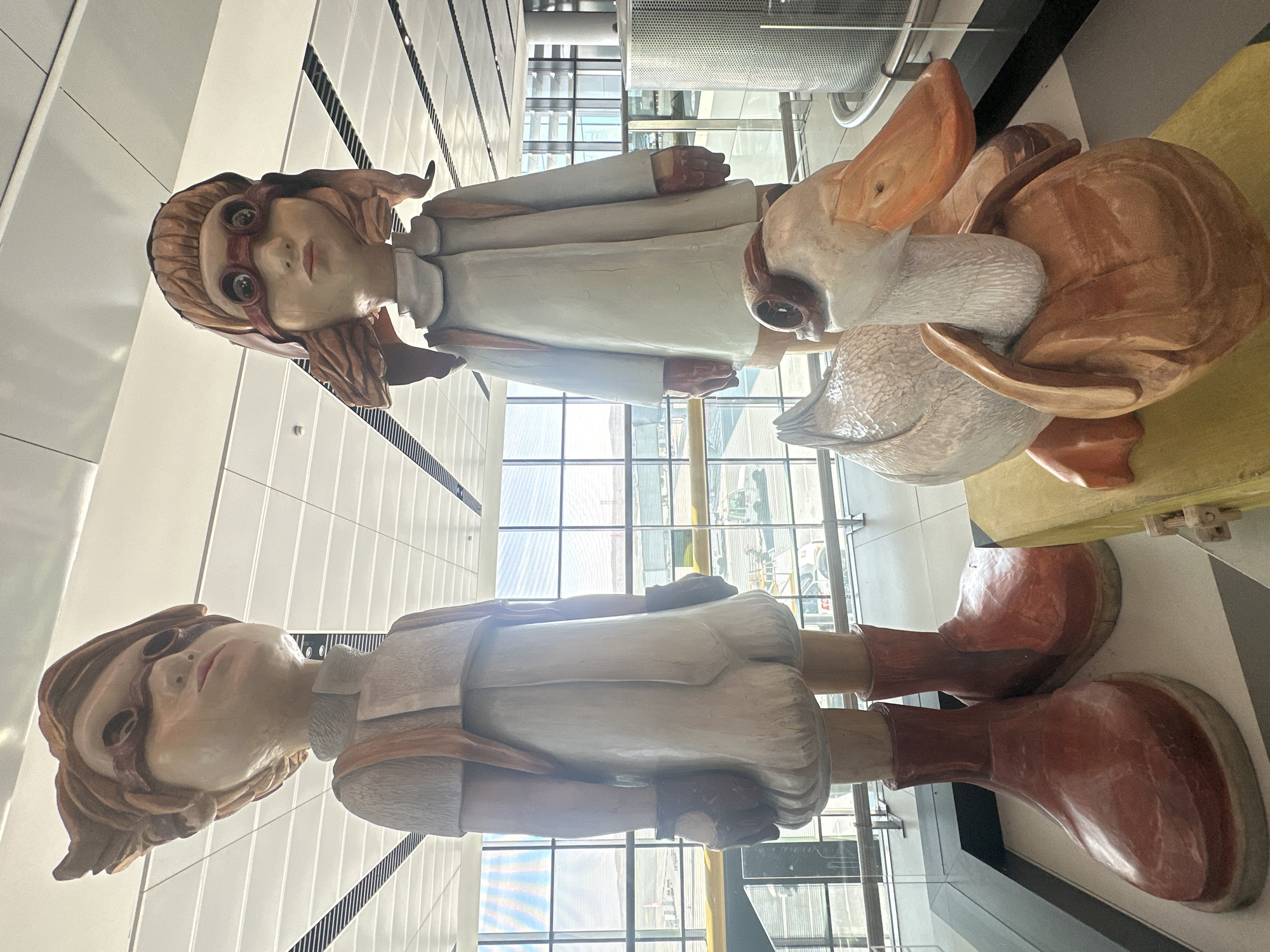 The scene depicts an indoor area within a modern airport terminal, specifically Istanbul Airport (IST) in Arnavutköy, Turkey. Three large, stylized sculptures are displayed in the foreground on a low, dark-rimmed platform, behind a clear protective barrier. On the left, a male child figure, approximately 2-3 meters tall, is sculpted from light-toned material, likely painted wood. He wears a light-colored high-collared shirt, short pants, reddish-brown gloves, and oversized reddish-brown boots. Dark, goggle-like coverings obscure his eyes, and a reddish-brown strap extends over his right shoulder. To his right stands a female child figure, also approximately 2-3 meters tall and of similar material. She is depicted wearing a light-colored long coat with a prominent collar, reddish-brown aviator goggles over her eyes, and her reddish-brown hair styled into pigtails. She also has reddish-brown straps over her shoulders and oversized reddish-brown boots, partially obscured by the duck sculpture. In front of the female figure, a sculpture of a white duck with an orange beak is positioned on a yellow, rectangular base. The duck wears a small brown satchel on its back. The background features a expansive glass curtain wall, divided into multiple panes, looking out onto an airport tarmac. Several aircraft, identifiable by their white and red fuselages, are visible in the distance, alongside ground support vehicles and various airport infrastructure. Beyond the tarmac, low hills or distant landforms are visible under a bright sky. The interior space has a light-colored floor, and the ceiling is a white grid system with integrated linear lighting fixtures. A tall, silver, perforated cylindrical object is present on the far right side of the image.
