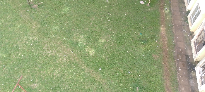 A high-angle view reveals a grassy lawn littered with scattered debris. The grass varies in color, with some areas appearing greener than others. A building with multiple windows borders one side of the lawn, separated by a narrow paved walkway. The composition suggests a neglected outdoor space adjacent to a residential or commercial building.