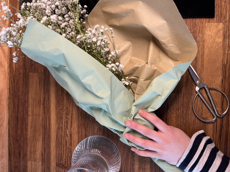 The scene, located in the city of Gangloff, Germany, presents a top-down view of a polished wooden surface. A person's left hand, with a black and white striped long-sleeved cuff, is positioned over a bouquet of white Gypsophila flowers. The flowers are wrapped in two layers: an inner layer of crumpled light brown kraft paper and an outer layer of light mint green tissue paper, which the hand appears to be arranging or securing. Below the hand and wrapping, a pair of metallic scissors with brass-colored pivot points rests on the wooden surface. To the upper left, a clear, fluted glass containing a small amount of liquid is visible. A dark, rectangular object is partially observed in the lower right, beneath the brown paper.