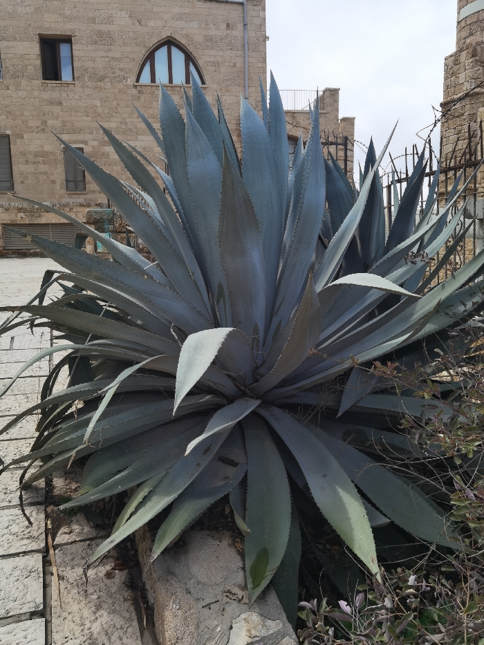 The image displays a large, robust blue-green agave plant centrally positioned in the foreground. Its thick, pointed leaves, some exhibiting serrated edges, radiate outwards. To the left of the plant, light-colored rectangular stone pavers are visible. To the right, sparse, drier-looking shrubbery is present. In the mid-ground and background, stone buildings are visible under an overcast, light grey sky. The building on the left, constructed of light-colored block, features two rectangular windows with dark shutters and one prominent arched window on an upper level. A metal railing is also visible on an upper section of this building. To the right, a darker section of a stone building is partially obscured by a dark metal fence topped with spikes and barbed wire. No individuals, actions, or interactions are depicted. The scene is set in an urban environment in Unknown, Unknown.