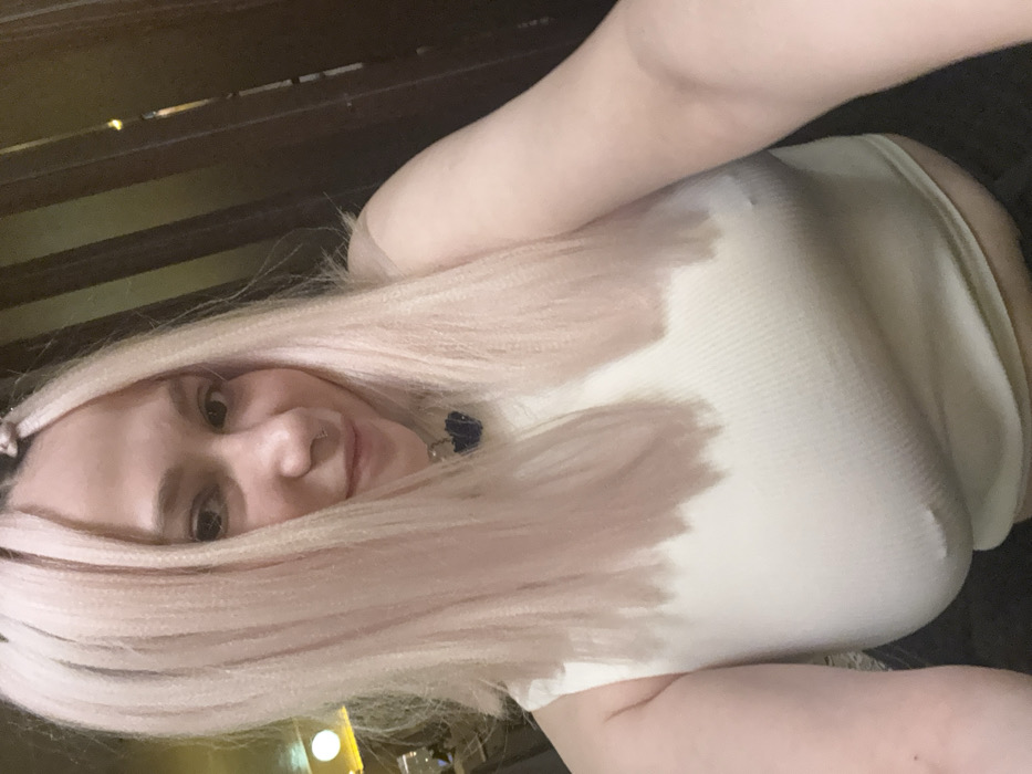 A person with pinkish-blonde hair, wearing a white ribbed tank top, is posing for a selfie